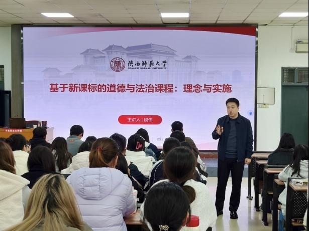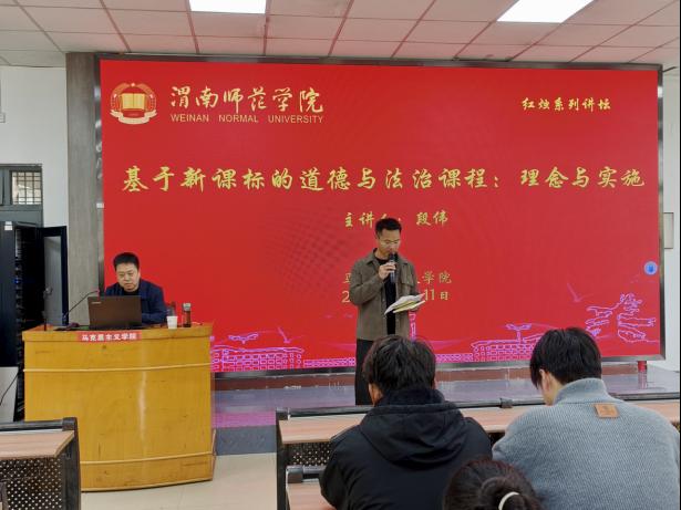 11月11日上午,马克思主义学院邀请中国教育学会中小学德育分会常务理事、教育部大中小学思政课一体化研究与建设中心研究员、陕西师范大学思政学科培训首席专家、陕西师范大学马克思主义学院基础教育教学研究中心主任段伟副教授作题为《基于新课标的道德与法治课程:理念与实施》的讲座。讲座由覃景冠老师主持。