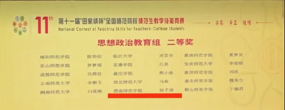 本次“田家炳杯”全国师范院校师范生教学技能大赛共有全国289所院校2345名选手参加,经过网络初赛,最终178所院校的564名选手晋级决赛,分13个组别进行。决赛采用现场抽签的方式决定比赛顺序,包括教学设计、多媒体课件制作、即席演讲、模拟上课∙板书等环节,多方面考核选手教学综合素养。成绩的取得离不开学院的高度重视,赛前组织开展多轮模拟教学演练,并邀请一线高中思政课教师来院现场指导;也离不开杨子涵同学对教育教学的热爱,入校以来坚持不懈训练教学基本功,潜心钻研教学和课标教材,精心准备、刻苦训练,赢得评委和师生一致认可。