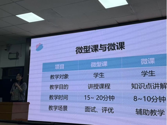 讲座伊始,李南颖老师从当前信息技术与教育深度融合的宏观背景切入,精准阐述了微课与微型课在现代教育体系中的重要作用。她首先厘清了“微课”作为以单一知识点为核心、结构完整的数字化教学资源,与“微型课”作为短时教学形式之间的区别与联系,为同学们构建了清晰的理论框架。李老师结合大量国家级、省级获奖微课案例,深入浅出地讲解了微课的创新性设计理念与实操方法。从教学内容的精炼萃取、叙事化脚本的撰写,到视听元素的美学设计与互动环节的巧妙嵌入,系统展示了如何将思政课的理论知识转化为生动、直观、富有感染力的微型数字化作品。并就微课在思政课翻转课堂、教学重难点突破、课后拓展学习及混合式教学等多元场景下的应用策略进行了介绍。
