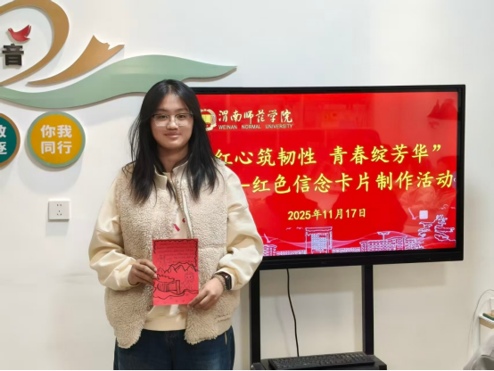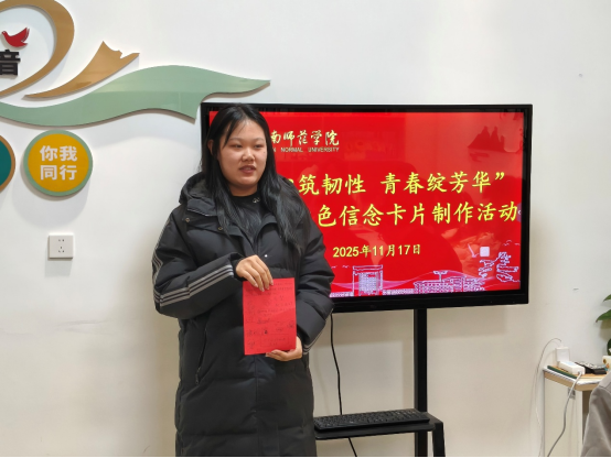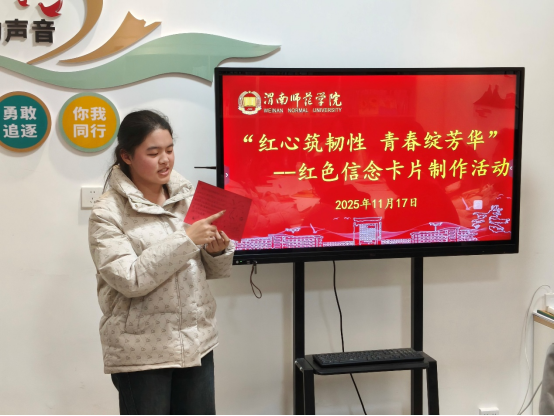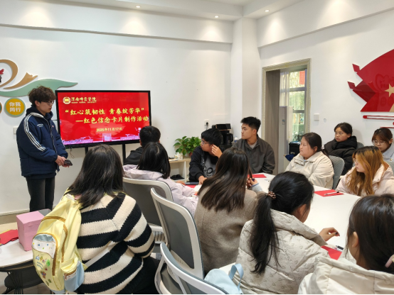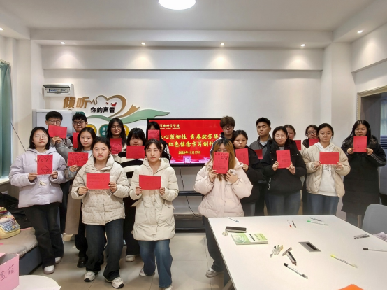 为让红色精神浸润青春成长,11月17日晚,马克思主义学院“红心筑韧性 青春绽芳华”红色信念卡片制作活动在一站式师生服务中心启幕。本次活动由学工办副主任谭宗英主持,25级部分同学参与。学生们以红色卡片为载体,让思政温度与青春情绪同频共振。