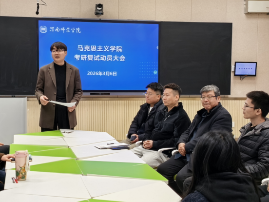2026年3月6日,为切实提升考研学子复试实战能力,精准助力学子决胜复试、顺利上岸,渭南师范学院马克思主义学院在1105召开考研复试冲刺动员大会。思想政治教育专业负责人周韶尉老师主持会议,马克思主义学院副院长路玉麟,青年教师代表蒙一鸣、刘泉葆、覃景冠、辛一凡、张晨阳出席并围绕复试策略、经典研读、面试技巧及调剂方针作专题指导,学院30余名初试过线学子参会。